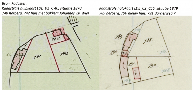 In 1871 krijgt zoon Johan van der Wiel een stuk van perceel C3 en perceel C4 toebedeeld uit de erfenis van zijn ouders. Hij bouwt hier op de hoek Oude Postbaan–Kaarpad een woning met bedrijfsruimte, het huidige Kaarpad 1. Hij verhuist hier met zijn bakkerij naartoe. Later heeft de familie Hermes hier gewoond. De vier zussen Arnolda, Maria, Cornelia en Johanna krijgen de herberg met winkel toebedeeld. De drie zussen Arnolda, Maria en Cornelia blijven gedrieën wonen in de herberg en winkel. Johanna huwt met bakker Johannes Schelling te Boxtel en gaat daar wonen. Op 2 mei 1872 overlijdt de andere zus Margaretha te Best. Haar dochtertje Arnolda van den Berg, geboren te Best op 3 feb 1872, komt op 31 jan 1878 bij de drie zussen in de herberg wonen. In 1879 bouwen de drie zussen aan de rechterzijde vast aan de herberg en winkel, een nieuw huis C790 op huidige locatie Barrierweg nr. 5. Op 31 maart 1882 overlijdt zus Cornelia. Cornelia heeft op 19 april 1880 haar testament op laten maken bij notaris van Dijck te Sint Michielsgestel waarbij Arnolda en Maria als enige erfgenamen worden benoemd. Haar erfdeel uit de nalatenschap van haar ouders bedraagt na aftrek van schulden en lasten ƒ 1988,49. Deze aangifte is gedaan op 18 sept 1882 door de twee erfgenamen. Op 30 oktober 1883 vindt scheiding van goederen van de totale nalatenschap van de ouders van de kinderen Van der Wiel plaats tussen Arnolda, Maria en zus Johanna, gehuwd met de Boxtelse bakker Johannes Schelling. Deel Maria, de eerste comparant: Huis C789 (herberg met winkel) met uitzondering van het afgepaalde gedeelte van het perceel met stal. Waarde ƒ2100,- en 2 percelen grond totale waarde ƒ800,-. Ze heeft ƒ2250,- toebedeeld gekregen en moet ƒ650,- betalen aan Arnolda. Opmerking: Omdat C789, de Herberg, en C790 vast aan elkaar gebouwd zijn wordt bij de scheiding van goederen bepaald dat de linker eindgevel toebehoort aan Maria. Deel Arnolda: huis en sectie C790, stal en grond zoals vernoemd uit perceel C788 en gedeelte uit perceel C789 zoals afgepaald. Totaal geschatte waarde ƒ1300,- + uitkering eerste comparant ƒ650,- en perceel grond ter waarde van ƒ60,- en manufacturen ƒ240,-, totaal ƒ2250,-. Deel Johannes Schelling: Aan manufacturen ƒ460,- en kruidenierswaren ƒ338,- en herberggereedschappen ƒ216,- en contanten ƒ370,-. noot: getrouwde vrouwen werden in die tijd nog als handelingsonbekwaam beschouwd dus de erfenis van Johanna kwam op naam van haar man. In 1884 wordt de herberg met winkel afgebroken en herbouwd. Maria huwt op 19 mei 1884 op 48-jarige leeftijd met Johannes Welvaarts, 46 jaar oud, een landbouwer uit Kleinder Liempde. Johannes gaat bij Maria wonen en wordt winkelier. Op 17 april 1891 overlijdt Johannes.